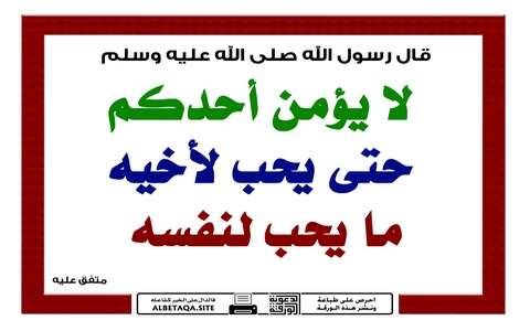 لهذا وغيره يؤكد الإسلام على ضرورة أن يمتلئ قلب المسلم بحب الخير لغيره، بل يُشيرُ النبي صلى الله عليه وسلم إلى أن من حُرم هذا الخلق فإن إيمانه يبقى ضعيفا منقوصا. فعن أنس عن النبي صلى الله عليه وسلم قال: “لا يؤمن أحدكم حتى يحب لأخيه ما يُحب لنفسه” رواه البخاري. وعن أبي أمامة قال: إن فتى شاباً أتى النبي صلى الله عليه وسلم فقال: يا رسول الله ائذن لي بالزنا، فأقبل القوم عليه فزجروه وقالوا: مه! مه! فقال: “ادنه، فدنا منه قريباً”، قال: فجلس قال: “أتحبه لأمك؟” قال: لا. والله جعلني الله فداءك. قال: “ولا الناس يحبونه لأمهاتهم”. قال: “أفتحبه لابنتك؟” قال: لا. والله يا رسول الله جعلني الله فداءك قال: “ولا الناس يحبونه لبناتهم”. قال: “أفتحبه لأختك؟” قال: لا. والله جعلني الله فداءك. قال: “ولا الناس يحبونه لأخواتهم”. قال: “أفتحبه لعمتك؟” قال: لا. والله جعلني الله فداءك. قال: “ولا الناس يحبونه لعماتهم”. قال: “أفتحبه لخالتك؟” قال: لا. والله جعلني الله فداءك. قال: “ولا الناس يحبونه لخالاتهم”. قال: فوضع يده عليه وقال: “اللهم اغفر ذنبه وطهر قلبه، وحسن فرجه” فلم يكن بعد ذلك الفتى يلتفت إلى شيء” رواه أحمد.
