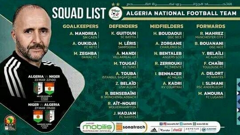 وغاب حسام عوار، الذي قرر الانضمام إلى كتيبة المنتخب الجزائري مؤخرا، كما كان متوقعا، إذ طلب من بلماضي تأجيل التحاقه بالخضر إلى وقت لاحق لأسباب فنية. فيما لم يحضر اسم مدافع فيردر بريمن الألماني، ميتشيل فايزر، الذي أعلن رغبته في اللعب للخضر. هذا وقد وجه المدرب الوطني جمال بلماضي الدعوة لـ25 لاعبا، تحسبا للمواجهتين اللتين سيخوضهما “الخضر” أمام النيجر يومي 23 و 27 مارس الجاري، لحساب الجولتين الثالثة والرابعة (المجموعة السادسة) لتصفيات كأس إفريقيا للأمم-2023 (المؤجلة لسنة 2024) بكوت ديفوار.