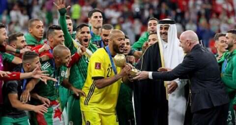 وكتب الشيخ تميم بن حمد آل ثاني، في حسابه الرسمي على “تويتر”: “أبارك للمنتخب الجزائري فوزه المستحق بكأس العرب 2021. كانت بطولة مميزة عكست تطور الكرة العربية ونتطلع للقائكم العام القادم في كأس العالم 2022. كما أهنئ منتخبنا الوطني القطري على فوزه اليوم وحصوله على المركز الثالث وبالمستوى الذي ظهر فيه خلال البطولة. مع تمنياتي لهم بالتوفيق في قادم المشاركات. وكان أمير قطر مرفوقا برئيس الفيفا جياني انفانتينو هو الذي سلم الكأس العربية لقائد المنتخب الجزائري رايس مبولحي. وبفضل هذا الفوز على تونس انتزع “الخضر” بقيادة الناخب الوطني، مجيد بوقرة، لقبهم العربي الأول في تاريخ مشاركاتهم في هذه المنافسة.