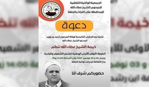 و تم في إطار هذه التظاهرة التي نظمتها المديرية المحلية للثقافة بالتنسيق مع الجمعية الولائية الثقافية للمرحوم الشيخ عطاء الله للمحافظة على التراث بالجلفة، استذكار هذه الشخصية الفنية التي أعطت الكثير للميدان الثقافي وحفظ التراث اللامادي من شعر وملحون وأصالة طيلة مشواره الفني .