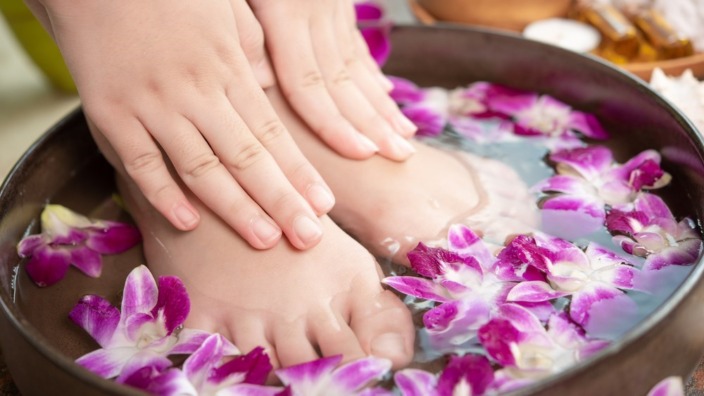 ابدئي بتدليل قدميكِ ونقعها في حوض صغير مملوء بالماء الدافئ مع إضافة 2 ملعقة كبيرة من زيت الزيتون، فيساعد ذلك على ترطيب وتنعيم القدمين، ليسهل إزالة الجلد الميت، كما يمكن أيضًا إضافة بضع قطرات من أي زيت عطري مضاد للبكتيريا، كزيت الروزماري أو الكافور. أيضًا، أضيفي شرائح الليمون للماء الدافئ أثناء نقع القدمين للتخلص من الروائح غير المحببة، تنقع القدمان في الماء الدافئ لمدة 15 دقيقة.