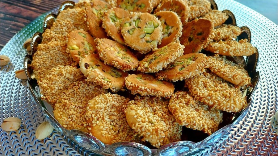 في إناء واسع أو صينية بحواف نضع الجلجلان نضيف عليه السكر، نمزج جيدا، ثم نضيف ملعقتين من السيرو، نمزج ونفرك جيدا بين الأصابع، نتركه جانبا عند الاستخدام نضيف حوالي ملعقة إلى ملعقة ونصف ماء ونفرك الجلجلان. الغرض من اضافة الماء هو لنفصل حبيبات الجلجلان ويساعد على التصاقه بالعجين لا يجب المبالغة عند اضافة الماء.