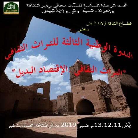 تستعد هذه الأيام ولاية البيض لاحتضان ندوة وطنية للتراث الثقافي تحت شعار “التراث الثقافي – الاقتصاد البديل” أيام 11،12،13 نوفمبر 2019 بدار الثقافة محمد بلخير، وتحت إشراف مديرية الثقافة ووالي ولاية البيض وبحضور أساتذة مختصين من 16 ولاية لتنشيط فعاليات هذه الندوة بالتطرق إلى عدة محاور كالتشريعات القانونية للتراث الثقافي، القصور العتيقة بين الحماية والتنمية ودور المواقع والمعالم الأثرية في تنمية السياحة مع تشريح ودراسة مقاربة بين التجربة التونسية والجزائرية في تنمية القصور الصحراوية واستغلالها، التنمية السياحية في القصور الصحراوية، فيما سيتطرق أساتذة آخرون إلى واقع السياحة والمعالم الاثرية كل بولايته ومنها التراث الأثري ودوره في التنمية السياحية بولاية تيارت وكذا التراث العمراني بولاية بشار واقع وتحديات، العمارة الأوراسية من خلال المعالم والمواقع المنتشرة عبر الإقليم لممثل ولاية باتنة.