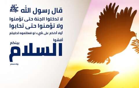 ثانياً: أهمية إفشاء السلام بين المسلمين على من يُعرف ومن لا يُعرف، فَعَنْ أَبِي هُرَيْرَةَ رَضِيَ اللَّهُ عَنْهُ، قَالَ: قَالَ رَسُولُ اللَّهِ صَلَّى اللَّهُ عَلَيْهِ وَسَلَّمَ: ” لَا تَدْخُلُونَ الْجَنَّةَ حَتَّى تُؤْمِنُوا وَلَا تُؤْمِنُوا حَتَّى تَحَابُّوا، أَوَلَا أَدُلُّكُمْ عَلَى شَيْءٍ إِذَا فَعَلْتُمُوهُ تَحَابَبْتُمْ، أَفْشُوا السَّلَامَ بَيْنَكُمْ” رواه مسلم.
