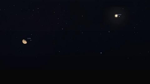 ويعد هذا المشهد تقاربًا فلكيًا رائعًا، حيث سيكون القمر والمشتري في أقرب مسافة لهما، بفارق لا يتجاوز 5 درجة من المركز إلى المركز.