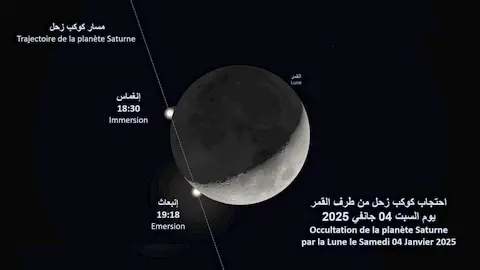 تشهد سماء الجزائر اليوم السبت على الساعة 18:30 مساء ظاهر فلكية نادرة لا ينبغي تفويتها، حيث سيحجب القمر، الذي سيكون على شكل هلال غليظ، كوكب زحل، حسب ما أفاد به بيان مركز البحث في علم الفلك والفيزياء الفلكية والفيزياء الأرضية