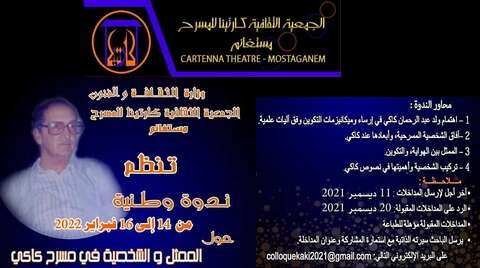 تنظم الجمعية الثقافية كارتينا لمسرح مستغانم يومي 11 و12 نوفمبر الجاري الملتقى الوطني حول الممثل والشخصية في مسرح كاكي، حيث يتطرق المشاركون في هذا الملتقى إلى عدة محاور منها اهتمام ولد عبد الرحمان كاكي في إرساء ميكانيزمات التكوين وفق آليات علمية وآفاق الشخصية المسرحية وأبعادها عند كاكي ومحور آخر يتطرق فيه المختصون إلى الممثل بين الهواية والتكوين وأيضا تركيب الشخصية