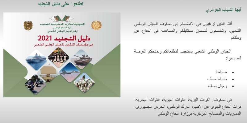 أصدرت وزارة الدفاع الوطني دليل التجنيد في هياكل التكوين للجيش الوطني الشعبي لسنة 2021، حسب ما نشرته الوزارة في موقعها الإلكتروني .