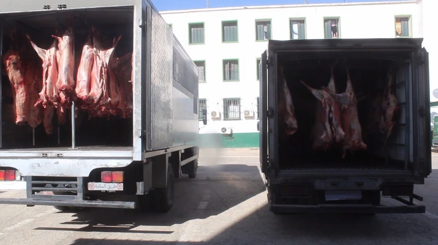 وبـ”التنسيق مع المصلحة المركزية للأمن الغذائي بقيادة الدرك الوطني والمجموعة الإقليمية للدرك الوطني بالجزائر العاصمة، ومن خلال الاستغلال الجيد للمعلومة، تم حجز 50 قنطارا من اللحوم الحمراء على متن شاحنتين قادمتين من أحد المدن الشمالية باتجاه إحدى ولايات الجنوب. وبعد معاينتها من طرف المفتشة البيطرية لعين وسارة تبين أنها لحوم مجهولة المصدر لكونها من سلالة الجنوب تم نقلها دون الختم البيطري وهو ما يستدعي إتلافها”.