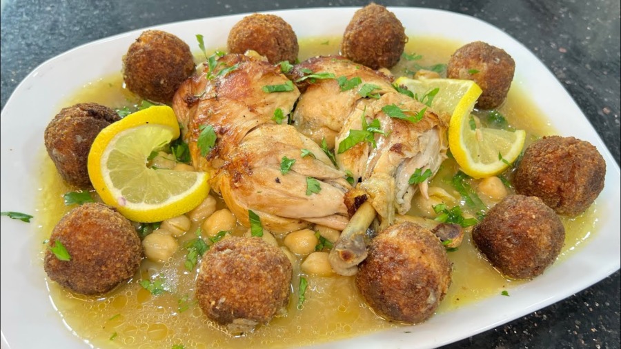 نرص حبات السفيرية في صحن التقديم وتسقى بالمرق والحمص و تزين بفخذ الدجاج (يمكن ادخال فخذ الدجاج للفرن لياخد اللون المحمر الجميل قبل وضعه بالصحن) تزين بشرائح الليمون