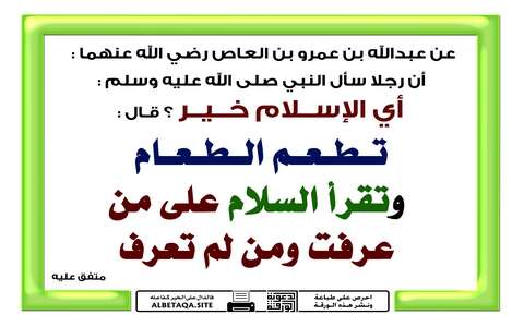 ومن السنة المطهرة: عن عبد الله بن عمرو بن العاص: أن رجلًا سأل رسول الله صلى الله عليه وآله وسلم: أي الإسلام خير؟ قال: “تُطعِم الطعام، وتقرأ السلام على مَنْ عرَفْتَ ومَنْ لم تعرِف”. رواه البخاري، وعن البراء بن عازب قال: “أمرنا رسول الله صلى الله عليه وآله وسلم بسبع: بعيادة المريض، وإتباع الجنائز، وتشميت العاطس، ونُصْرة الضعيف، وعون المظلوم، وإفشاء السلام، وإبرار القسم” رواه البخاري، وعن أبي هريرة قال: قال رسول الله صلى الله عليه وآله وسلم: “لا تدخلوا الجنة حتى تؤمنوا، ولا تؤمنوا حتى تحابوا، أولا أدلُّكم على شيء إذا فعلتموه تحابَبْتُم؟ أفشوا السلام بينكم” رواه مسلم.