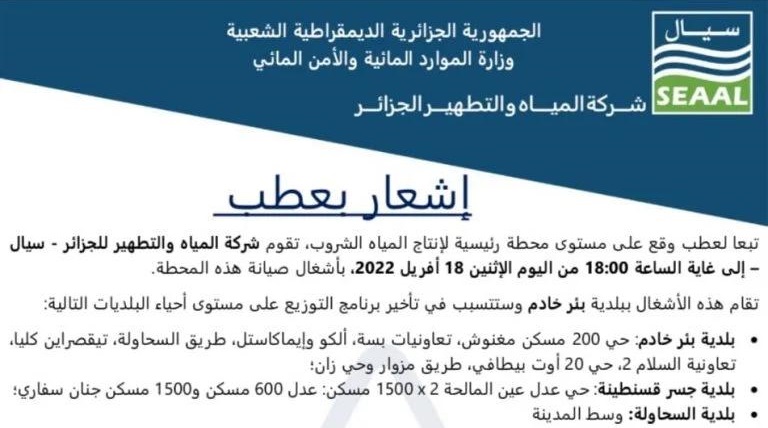 أعلنت شركة المياه والتطهير للجزائر عن تذبذب في عملية توزيع المياه عبر 3 بلديات بالعاصمة، تبعا لعطب وقع على مستوى محطة رئيسية لإنتاج المياه الشروب.