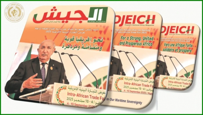 وفي افتتاحية بعنوان “من أجل قارة آمنة ومستقرة ومزدهرة”، قالت المجلة إن الجزائر تواصل بثقلها الاقتصادي وديناميكيتها التنموية تكريس موقعها كفاعل أساسي في مسار التنمية والاندماج الإفريقي باحتضانها شهر سبتمبر الجاري للطبعة الرابعة لمعرض التجارة البينية الإفريقية وهو موعد هام يجسد التزام بلادنا وسعيها الحثيث لتعزيز التبادل التجاري البيني في إطار منطقة التجارة الحرة القارية الإفريقية, بما ينعكس إيجابا على التنمية الاقتصادية والاجتماعية لدول القارة وشعوبها وأبرزت ان الجزائر التي تعد ثالث أكبر اقتصاد إفريقي, وتطمح لاعتلاء صدارة الاقتصاديات الإفريقية خلال السنوات القليلة القادمة ستتمكن حسب العديد من الخبراء الاقتصاديين من الإسهام بفعالية في تسريع وتيرة الاندماج التجاري والاقتصادي للقارة وذلك بفضل ما تتوفر عليه من مؤهلات اقتصادية وإمكانات تنافسية, فضلا عن موقعها الاستراتيجي حيث يشكل انتماؤها الحوض البحر المتوسط بوابة نحو أوروبا فيما يمنحها عمقها الإفريقي منفذا مميزا إلى أسواق القارة، وهو ما يؤهلها للعب دور اقتصادي محوري يرسخ مكانتها كقوة اقتصادية صاعدة ومحرك أساسي للتنمية في إفريقيا. وبعد ان ذكرت بأن الجزائر التي ساندت بالأمس العديد من دول القارة السمراء في مسيرة تحررها من نير الاستعمار أكدت انها تواصل اليوم مناصرة القضايا العادلة وفي مقدمتها قضية الصحراء الغربية تسجل دوما حضورها المؤثر في جميع آليات العمل الإفريقي المشترك مؤكدة أنها ستظل طرفا فاعلا وجزء لا يتجزأ من الجهد الجماعي الرامي لكسب رهانات التنمية الاقتصادية والتكامل القاري وتحقيق الرؤية الطموحة التي أرسى معالمها الاتحاد الإفريقي ولاسيما من خلال دعمها القوي والمميز لمختلف المشاريع الكبرى ذات البعد الإفريقي. ولفتت إلى ما أكده رئيس الجمهورية السيد عبد المجيد تبون حينما توجه إلى القادة والمسؤولين الأفارقة المشاركين في معرض التجارة البينية الإفريقية 2025، داعيا إياهم إلى “جعل هذه الطبعة منطلقا جديدا وعهدا متجددا نضع فيه أيدينا في أيدي البعض لنسير بخطى ثابتة نحو افريقيا قوية متضامنة ومزدهرة” مضيفا “لتصنع إفريقيا غذاءها بنفسها ولتستمر وتستثمر ثرواتها لصالح أبنائها وبناتها وتنتزع مكانتها عن جدارة واستحقاق في عالم اليوم والغد على حد سواء .. نحن نناضل من أجل تنمية إفريقية حقيقية”. وإيمانا منها بالترابط الوثيق بين الأمن والتنمية –تضيف الافتتاحية– تبذل الجزائر جهودا مضنية وتؤدي دورا محوريا لتعزيز الأمن والاستقرار بالقارة، لا سيما في ظل تعدد بؤر التوتر والأزمات والنزاعات وتفشي الإرهاب والتطرف العنيف والجريمة المنظمة بمختلف أشكالها, وذلك عبر إسهامها في مختلف الأطر العملياتية القارية المشتركة للتعاون في مجال مكافحة الإرهاب على غرار لجنة أجهزة الأمن والمخابرات الإفريقية وآلية الاتحاد الإفريقي للتعاون الشرطي ولجنة الأركان العملياتية المشتركة والمركز الإفريقي للدراسات والبحوث المتعلقة بالإرهاب، وهو ما أكده السيد الفريق أول السعيد شنقريحة الوزير المنتدب لدى وزير الدفاع الوطني, رئيس أركان الجيش الوطني الشعبي شهر ماي الفارط في كلمة له وجهها للمشاركين في تمرين سلام شمال إفريقيا 3 الذي احتضنته بلادنا, مشيرا أن هذا التمرين يأتي تفعيلا لالتزاماتنا الثابتة لدعم آليات السلم والأمن القاري, وتعزيز أواصر التعاون العسكري الإقليمي تحت راية الاتحاد الإفريقي, بهدف تحقيق الأهداف الاستراتيجية الإفريقية للسلم والأمن خاصة ما تعلق بجعل قارتنا أكثر استقرارا وازدهارا ,وهي غاية بلدي الجزائر التي تتشرف بانتخابها مرة أخرى عضوا في مجلس الأمن والسلم الإفريقي. وأكدت المجلة أن الجزائر التي طالما كانت ولا تزال صوتا صداحا يدافع عن افريقيا ويرافع في مختلف المحافل الدولية عن مصالحها وطموحات دولها وشعوبها بقدر ما تحمل هموم القارة وهواجسها تحتضن أيضا تطلعاتها وأمالها لتحقيق النهضة والنماء والازدهار في ك