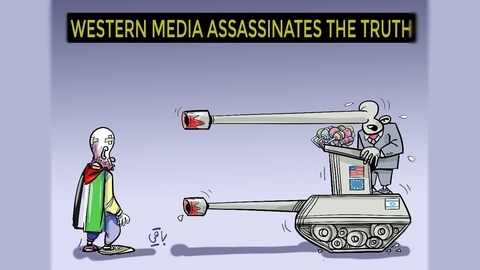 لكن تظل أكثر رسوماته انتشاراً، تلك التي تتطرّق إلى انحياز الإعلام الغربي للاحتلال ضدّ الفلسطينيين. تصور اللوحة رجلاً يخطب من فوق دبابة إسرائيلية توجه فوهة مدفعها إلى فلسطيني أعزل، وأنف الرجل في شكل فوهة موجهة في الاتجاه نفسه، مبينة كيف صار الفلسطيني ضحية لدبابات العدو وللإعلام الغربي على حد سواء.
