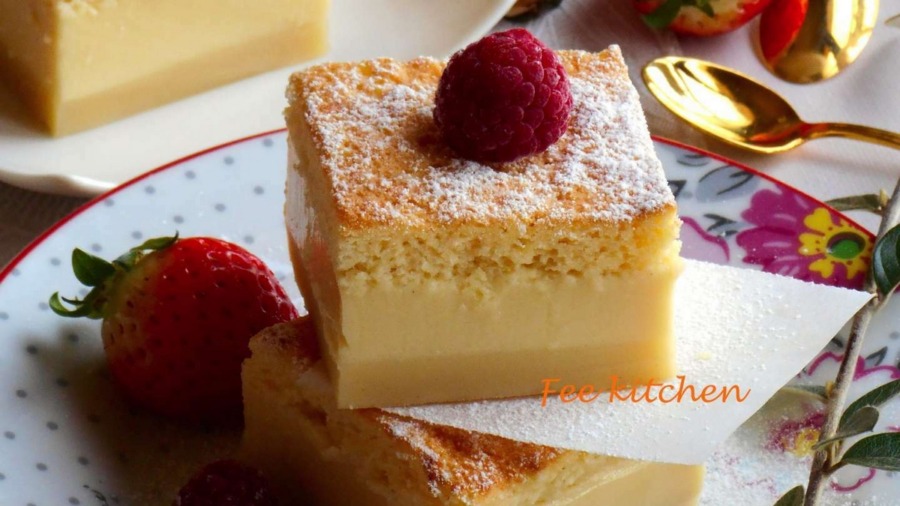 نسكب المزيج بصينية مدهونة مسبقا ومرشوشة بالفرينة بمقاس 20 على 30 سم وتدخل لفرن مسخن مسبقا على درجة حرارة 180 لمدة 45 دقيقة إلى 50 د حسب نوعية الفرن، يدخل للثلاجة على الأقل بـ 3 سا قبل التقديم.
