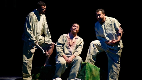 يحكي العرض قصة ثلاثة سجناء ينامون فوق قبر وعلى جانبهم الهيكل العظمي، اثنان منهم سجينان عاديان وآخر سجين مثقف، يقومون بقرعة الخاسر منهم سوف يقدم للأسد، أمام الجمهور، كما كان يحدث في عهد الرومان القدامى، وهنا يطرح عليهم سؤال مهم وهو لماذا هو يموت وهما لا؟ وينشأ ذلك الحوار ويتصاعد الصراع من أجل ضرورة التضحية بواحد منهم من أجل حياة الآخرين، خاصة وقد وقعت عليه القرعة، غير أن المشهد يتغير، حينما يرجع إليهم ذلك المثقف، الذي وقعت عليه القرعة لكي يموت، ويقول لهم إن من يموت سوف يربح الكثير من الأشياء، على غرار اللباس والأكل، وكذا الزواج وهنا يتغير الصراع، ويصبح صراع من أجل الموت وليس الحياة كما كان في السابق.