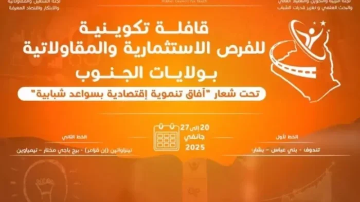 تنطلق مساء اليوم الاثنين من الجزائر العاصمة، القافلة التكوينية للفرص الاستثمارية والمقاولاتية لفائدة شباب الجنوب، تحت شعار “آفاق تنموية اقتصادية بسواعد شبابية”.