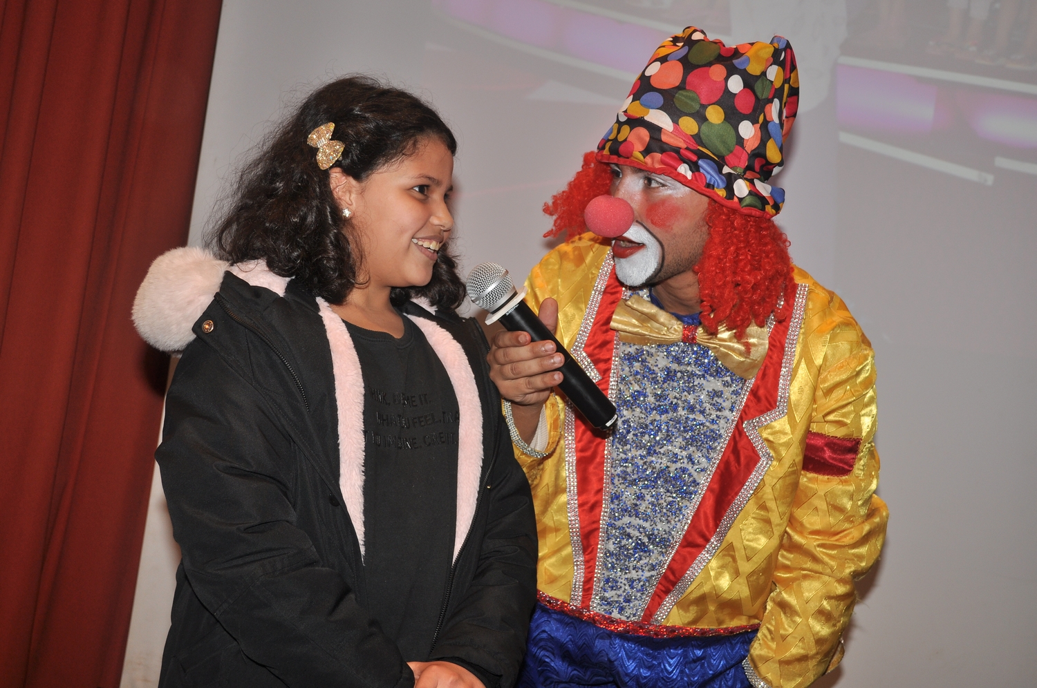 دخول المهرج “مينو” للقاعة لم يكن عاديا.. استقبله الأطفال بالهتاف، فرد عليهم بما يفرح قلوبهم الطيبة، وقدم لهم العديد من العروض الشيقة التي جعلت الأطفال مشاركين له فيها، فكان بحق محبوب الأطفال، فكانت بحق عروض أجمع كل من حضر على روعتها، كما ساعد المنظمات وقام هو بالمناداة على المستفيدين والمستفيدات.