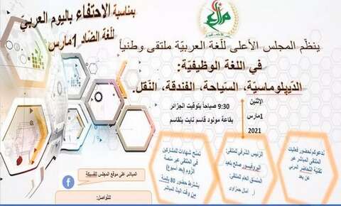 نظم المجلس الأعلى للغة العربية، الاثنين بالجزائر العاصمة، لقاء حول اللغات الوظيفية في مجالات الدبلوماسية والسياحة والنقل بمناسبة اليوم العربي للغة العربية المحتفل به في أول مارس.