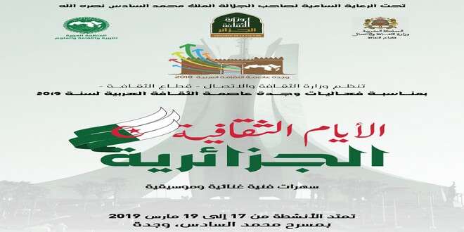تحتضن مدينة وجدة عاصمة الثقافة العربية، فعاليات الأيام الثقافية الجزائرية، المندرجة ضمن علاقات التعاون الثقافي القائمة بين المملكة المغربية ودولة الجزائر الشقيقة.