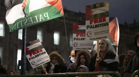 وقال متظاهرون -أمام مقر الجمعية- إن المستثمرين البريطانيين لا ينبغي لهم الاستثمار في شركات إسرائيلية بينما تحدث “ممارسات فصل عنصري وإبادة جماعية وجرائم حرب”.