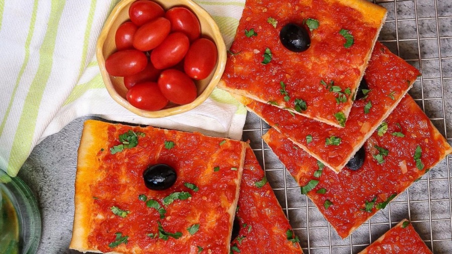 في إناء آلة العجن أو ممكن استعمال اليد فقط، نضع السكر وخميرة الخبز مع 220 ملل من الماء، نمزج جيدا ثم نضيف الفرينة وحبة البيض، الملح وحليب البودرة وزيت الزيتون، ونمزج جيدا الكل حتى نتحصل على عجين طري، إذا لم نتحصل على عجين طري، نضيف كمية من الماء حتى نتحصل على عجين طري ولين، نتركها لترتاح وتختمر جيدا، نبسطها على صينية مدهونة بالزيت بواسطة الأصابع فقط، لا نستعمل الحلال لكي لا ننزع فقاعات الهواء من العجين مع الاستعانة بقليل من الزيت.