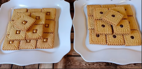 - نحلها بين كيسين بلاستكيين بسمك3 الى 4 ملم نطبعها بطابع على شكل مربع مزركش (حسب الرغبة) و ننزعه من الطابع بلطف لان العجينة هشة و تطهى