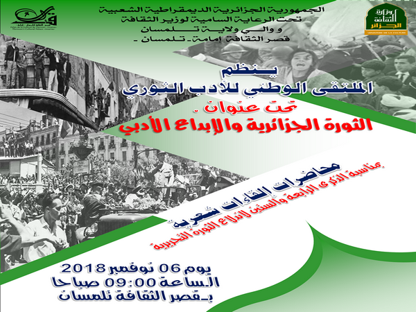 سيحتضن قصر الثقافة بإمامة بتلمسان الملتقى الوطني للأدب الثوري تخليدا لثورتنا المجيدة وذلك يومي 5 و6 نوفمبر الجاري، ويشرف على هذه التظاهرة الشاعر والناشط الثقافي نور الدين مبخوتي ومصلحة النشاط