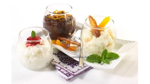 - يقدم الأرز بالشكلاطة في كؤوس ويزين بقشرة البرتقال المعسلة.