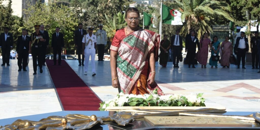 توجهت رئيسة جمهورية الهند, السيدة دروبادي مورمو, هذا الاثنين, الى مقام الشهيد (الجزائر العاصمة), حيث ترحمت على أرواح شهداء الثورة التحريرية المجيدة.