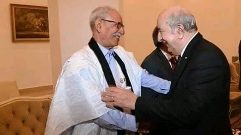 هنا رئيس الجمهورية الأمين العام لجبهة البوليساريو السيد إبراهيم غالي،الاثنين نظيره الجزائري السيد عبد المجيد تبون بعد فوزه بعهدة ثانية لرئاسة الجمهورية الجزائرية الديمقراطية الشعبية.
