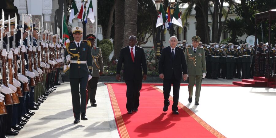 خص رئيس الجمهورية السيد عبد المجيد تبون فخامة رئيس جمهورية جنوب إفريقيا السيد سيريل رامافوزا باستقبال رسمي يليق بمقام ضيف الجزائر وبمستوى العلاقات بين البلدين بقصر المرادية .