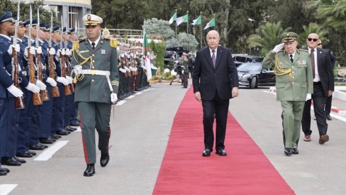 وبعد الاستماع الى النشيد الوطني، قدمت لرئيس الجمهورية التشريفات من قبل تشكيلات من مختلف قوات الجيش الوطني الشعبي التي أدت له التحية العسكرية.