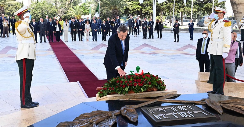 وضع رئيس مجلس الوزراء الإيطالي، ماريو دراغي، اليوم الاثنين، إكليلا من الزهور على النصب التذكاري بمقام الشهيد في الجزائر العاصمة.