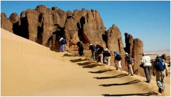 خلال الرحلة، يمكنك المبيت في العراء، وذلك بنصب الخيم وإشعال النار، ما يضفي منظرا ولا أروع، فيه امتزاج للألوان، وسماء تشبه الحلم، قمر مضيء، بنجوم مرصعة كأنها امرأة تارڤية في أحلى مظاهرها بالحلي ورداء _شاش_ باللون الأزرق، كان مطعمنا متنقلا وكان العالم مغايرا كأنك تقف قبالة _أقصى الوجود_، في الصباح تبدأ رحلة مشي جديدة بمجرد أن تبزغ الشمس تلك الهائلة والمختلفة، والذي يؤكده غالبية من ساروا في الصحراء هو أنهم يسيرون في صمت، أو ربما يكونون في حديث طويل مع الأعماق، عندما تبدأ الشمس في الابتسام وهي تخرج من وراء الكثبان الرملية، لا شيء سيكون سوى هذا التواصل مع الأرض.