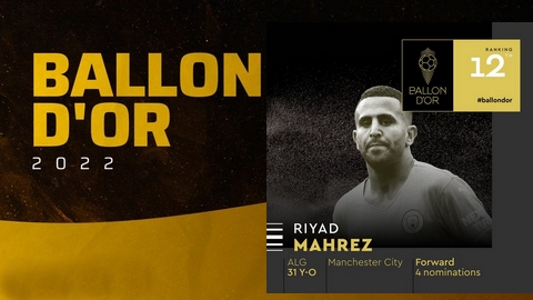 وتقدم نجم الخضر، رياض محرز نجم مانشستر سيتي 8 مراكز في ترتيب جائزة الكرة الذهبية لأفضل لاعب على مستوى العالم لعام 2022.