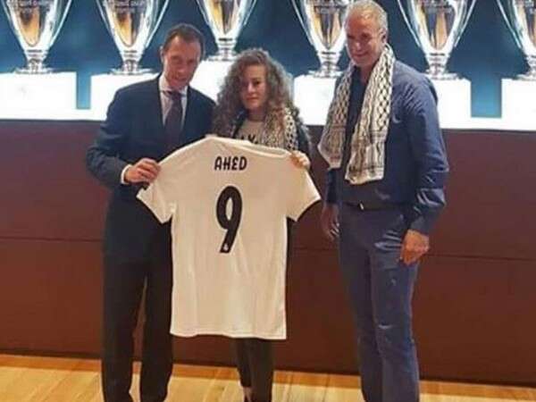 وذكرت تقارير صحفية اسبانية، الأحد، أن مدير العلاقات المؤسسية في النادي المدريدي، استقبل الشابة الفلسطينية عهد التميمي في مقر النادي وأهداها قميصًا لريال مدريد يحمل اسمها والرقم 9.