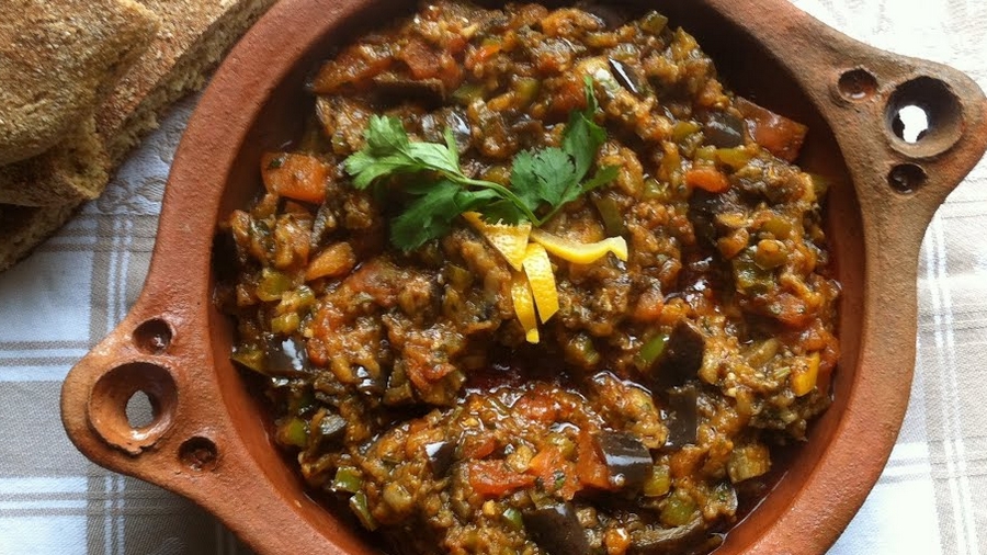 في طنجرة نضع كمية معتبرة من زيت الزيتون عندما يسخن نضع الباذنجان يتقلى قليلا، ثم نضيف بعد ذلك باقي المكونات ونحرك جيدا ونتركهم على نار هادئة جدا مع التحريك من حين لحين والضغط لامتزاج المكونات، يمكن إضافة حوالي فنجان صغير ماء إذا استلزم الأمر نتركها لمدة 20 دقيقة حتى تتجمر. عند التقديم نضيف القليل من زيت الزيتون والمعدنوس.
