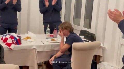 نشر الاتحاد الكرواتي لكرة القدم، مقطع فيديو من داخل معسكر المنتخب، يُظهر رد فعل لوكا مودريتش، قائد الفريق الوطني، بعد تكريمه من زملائه.