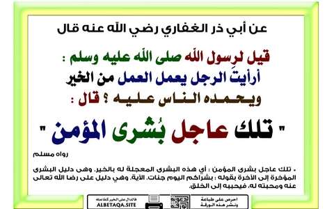 قيل لرسول الله صلى الله عليه وسلم، في الحديث الذي أخرجه مسلم عن أبي ذرٍّ رضي الله عنه: “أرأيتَ الرجل يعمل العمل من الخير ويحمده الناس عليه؟ قال: تلك عاجل بشرى المؤمن”. والبشارة كما هو معلوم خبر سارٌّ، يتلقاه الإنسان من الآخرين بالغبطة والحبور، وتتفتح له أسارير قلبه، وتبتهج له ملامح وجهه، وترتاح له نفسه، وتطمئن له ذاته، حتى وإن لم يلمس بعدُ ما بُشِّر به.