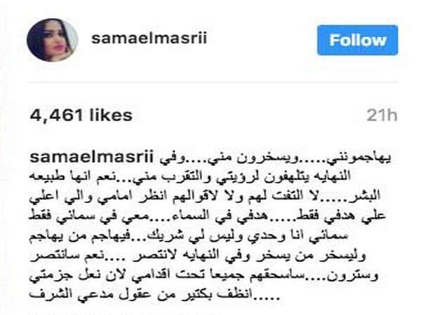 ونشرت سما صورة لها وهي تنظر إلى الأعلى وعلقت عليها قائلة: “يهاجمونني.. ويسخرون مني. وفي النهاية يتلهفون لرؤيتي والتقرب مني، نعم إنها طبيعة البشر.. لا ألتفت لهم ولا لأقوالهم.. أنظر أمامي وإلى أعلى على هدفي فقط.. هدفي في السماء. معي في سمائي، فقط سمائي أنا وحدي وليس لي شريكة، فيهاجم من يهاجم وليسخر من يسخر وفي النهاية أنتصر. نعم سأنتصر وسترون. سأسحقهم جميعًا تحت أقدامي لأن نعل حذائي أنظف بكثير من عقول مدّعي الشرف”.