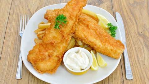 نسخن الزيت النباتي في طنجرة ونقلي فيها شرائح السمك حتى تصبح مقرمشة، ثم نصفيها ونقدمها مع الصلصة.