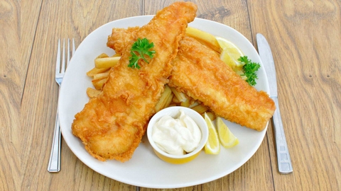 نسخن الزيت النباتي في طنجرة ونقلي فيها شرائح السمك حتى تصبح مقرمشة، ثم نصفيها ونقدمها مع الصلصة.