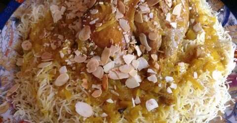 – توضع نصف كمية الشعرية في طبق التقديم، تزين بالدجاج والبصل ثم تغطى بالكمية المتبقية من الشعرية.