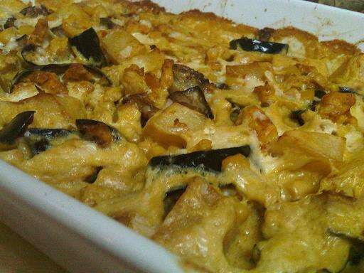ثم صفي المرق وقطعي صدور الدجاج إلى مكعبات، ثم يتم قلي الباذنجان في الزيت وبعدها ضعيه في صينية ثم اضيفي الدجاج والجبن مقطع مكعبات.