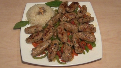 نغطي سطح طبق التقديم بمزيج البصل والفلفل ونضع فوقه أصابع الكباب ونقدمه مع الأرز.