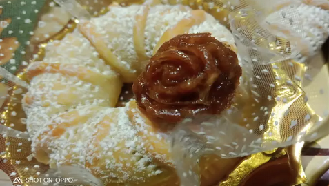 نبسط الكرية بحلال ونضع فوقها حربوش التمر ونلف حتى نتحصل على حربوش متجانس ونشكل حلقة ثم ننقش الحلقة ونضعها في صينية ونغطيها ونتركها ترتاح ساعة.