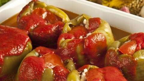 4- وزّعي مزيج اللحم داخل قطع الفلفل. أضيفي الكمية المتبقية من صلصة الطماطم على الوجه. أدخلي الصينية إلى الفرن لـ20-30 دقيقة حتى تنضج المكونات.