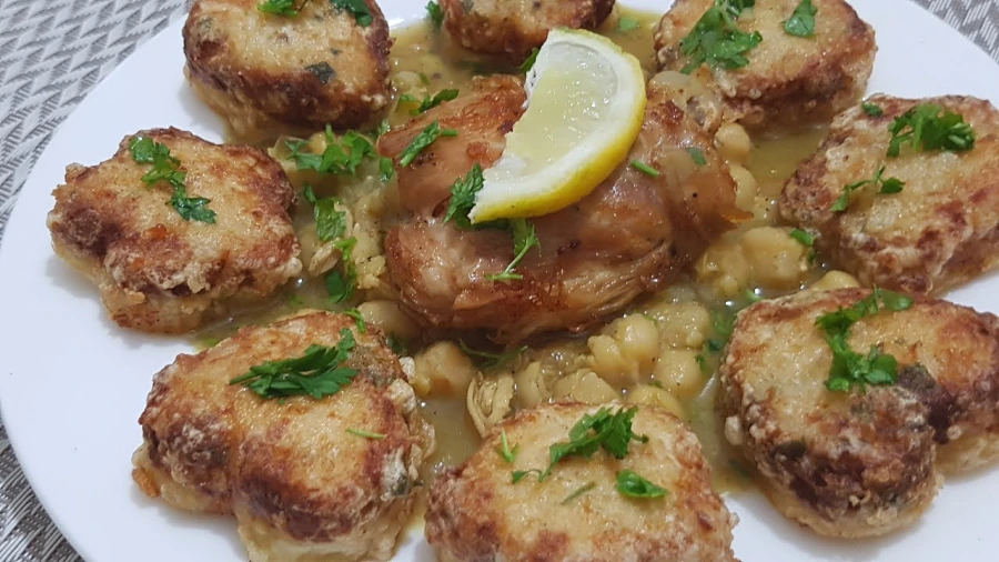نأخذ شريحة البطاطا االمتحصل عليها ونضعها أسفل القطاعة التي سنستعملها كقالب ونضيف فوقها خليط الدجاج، الجبن والبقدونس ونضغط ثم نزيل القالب سنتحصل على قلب أو وردة متكونة من طبقتين شريحة البطاطا وحشو الدجاج نرمدها بالفرينة ثم البيض ثم تقلى بزيت غزيرعلى نار أقل من متوسطة لكي تطهى البطاطا وتتحمر جيدا، ممكن التأكد من استواء البطاطا بغرز سكين. في صحن التقديم نضع الصلصة والحمص نضع فخذ الدجاج المحتفظ به جانبا في الوسط ونضع أشكال البطاطا والدجاج المتنوعة بالتناوب دائريا على أطراف الصحن ونزين بالبقدونس.