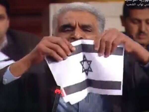 قام نائب عن الجبهة الشعبية، عمار عمروسية، بتمزيق علم إسرائيل خلال الجلسة العامة لمجلس نواب الشعب التونسي، الثلاثاء، احتجاجا على التأجيل المتكرر من لجنة الحقوق والحريات للنظر في مشروع قانون تجريم التطبيع مع إسرائيل.